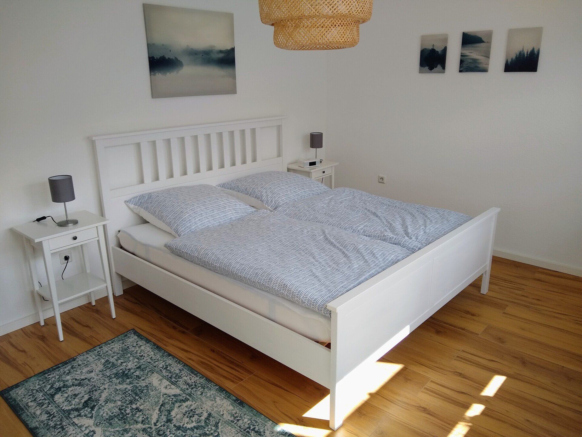 Gemütlich, moderne und komfortabel ausgestattete 63 qm-Ferienwohnung mit separatem Eingang, 2020 komplett renoviert. Die Wohnung befindet sich im 1. Obergeschoss. Großzügiges Wohn-Esszimmer mit SAT-TV und komplett ausgestatteter Essgruppe. 2 separate Doppelschlafzimmer mit SAT-TV, Bad mit Badewanne/Dusche und WC, Abstellraum und großzügiger Diele, halb überdachter Balkon mit Sitzgruppe und zwei Sonnenliegen mit Blick ins Grüne.